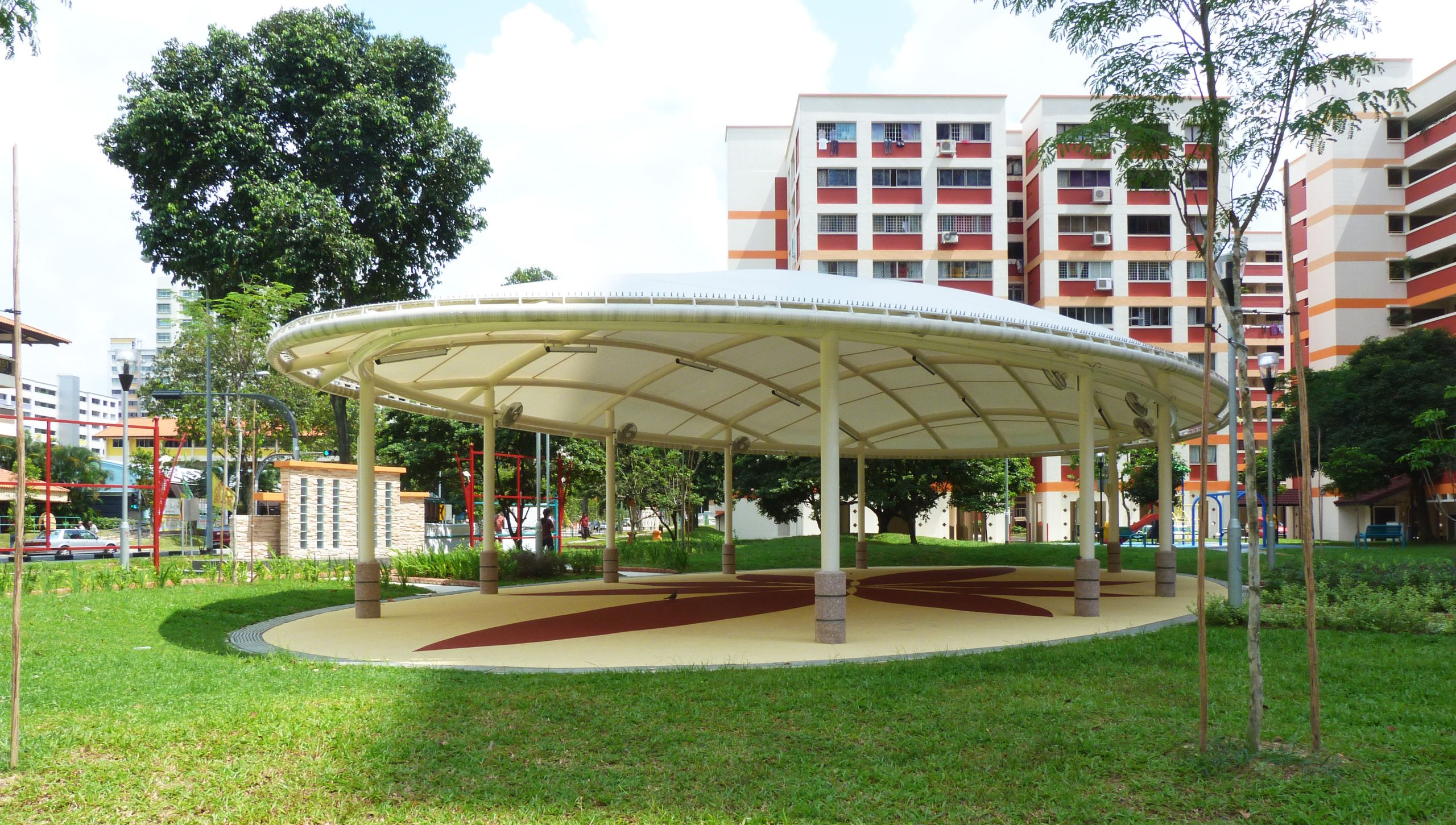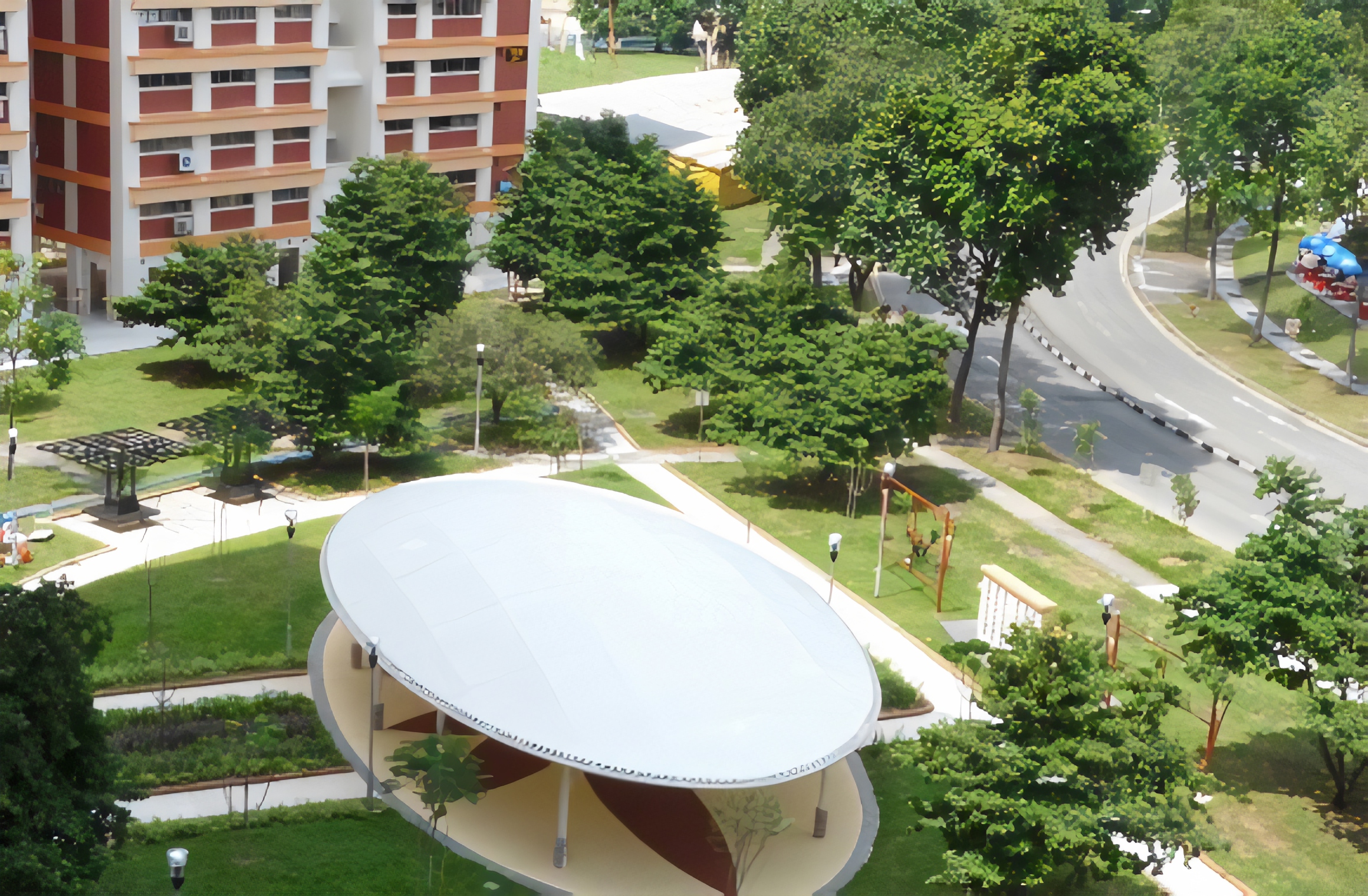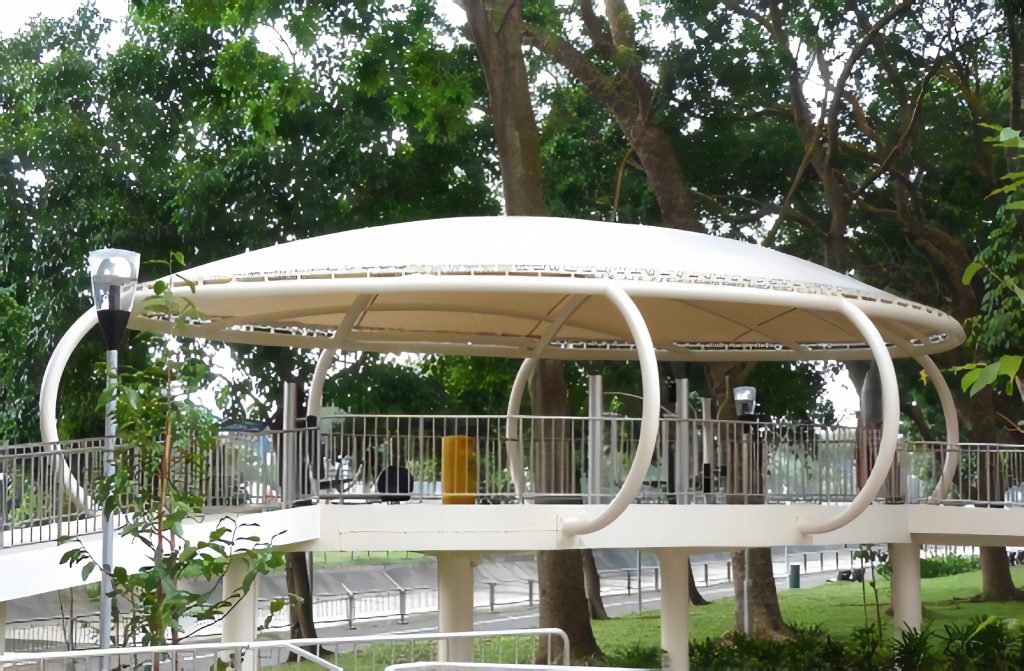 These elliptical ADAS® Tensile Membrane canopies create spaces of respite from the weather at the Bishan St 13 park and playground.