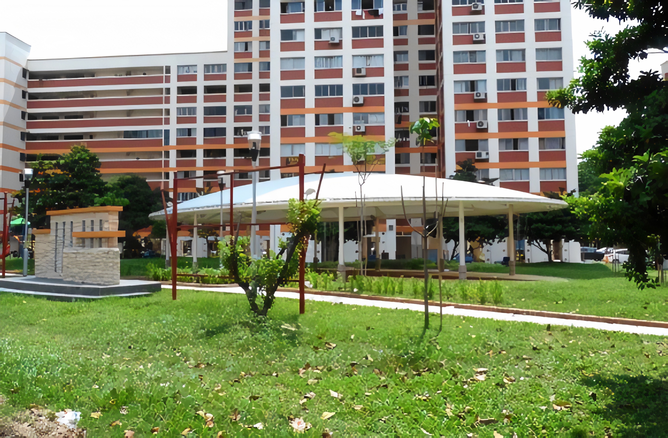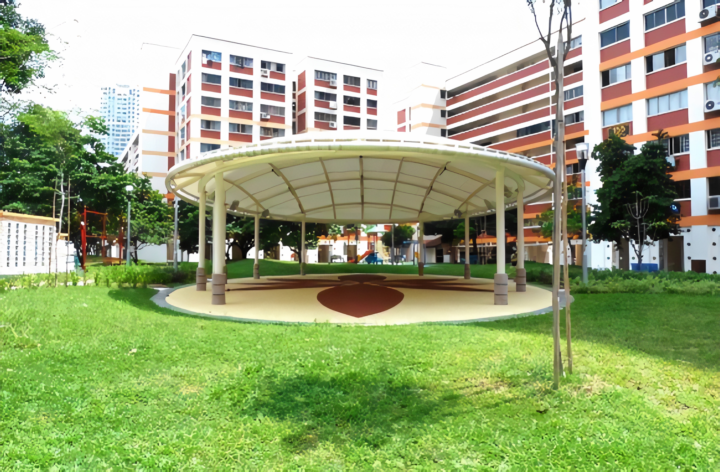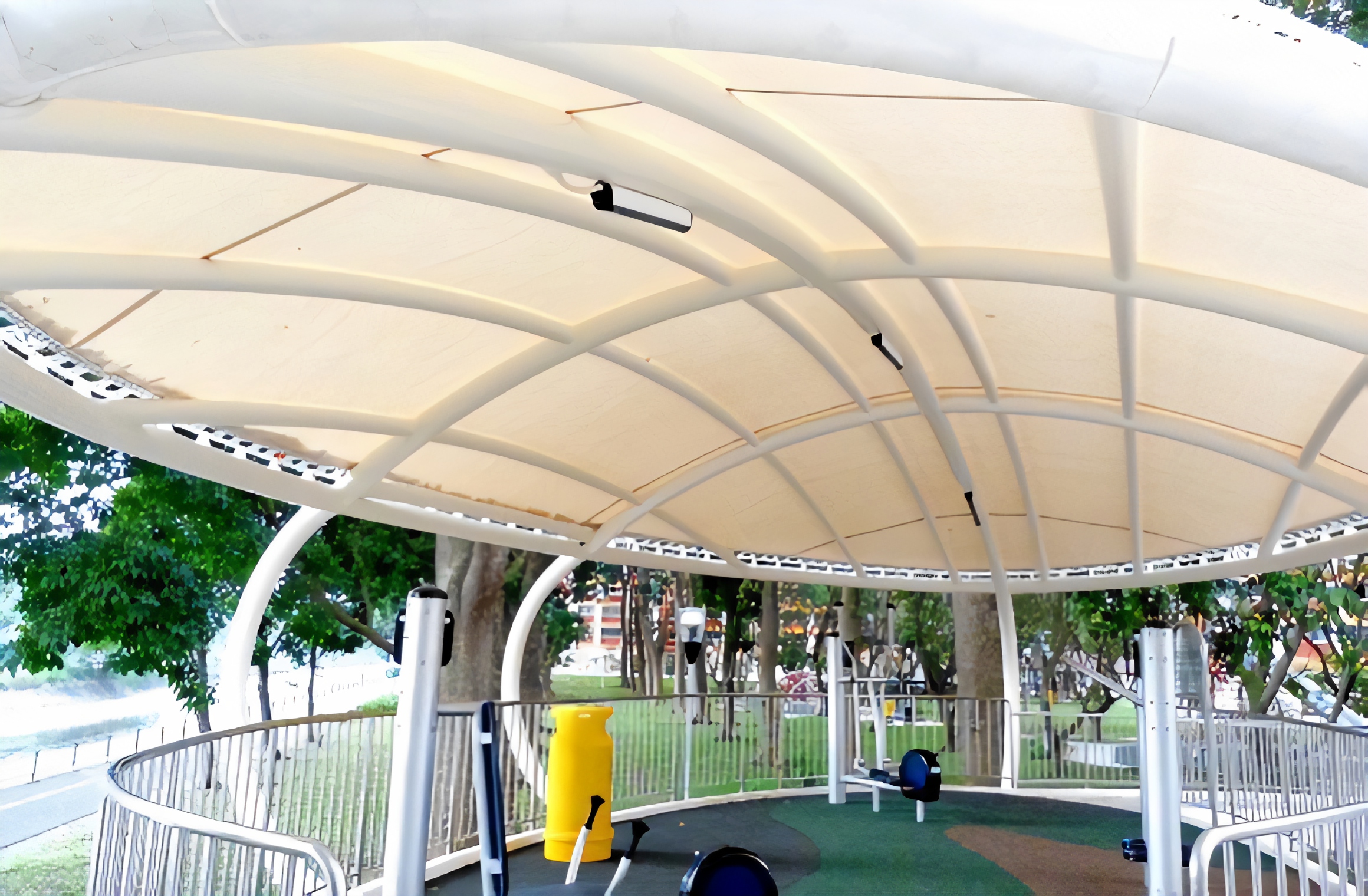 These elliptical ADAS® Tensile Membrane canopies create spaces of respite from the weather at the Bishan St 13 park and playground.