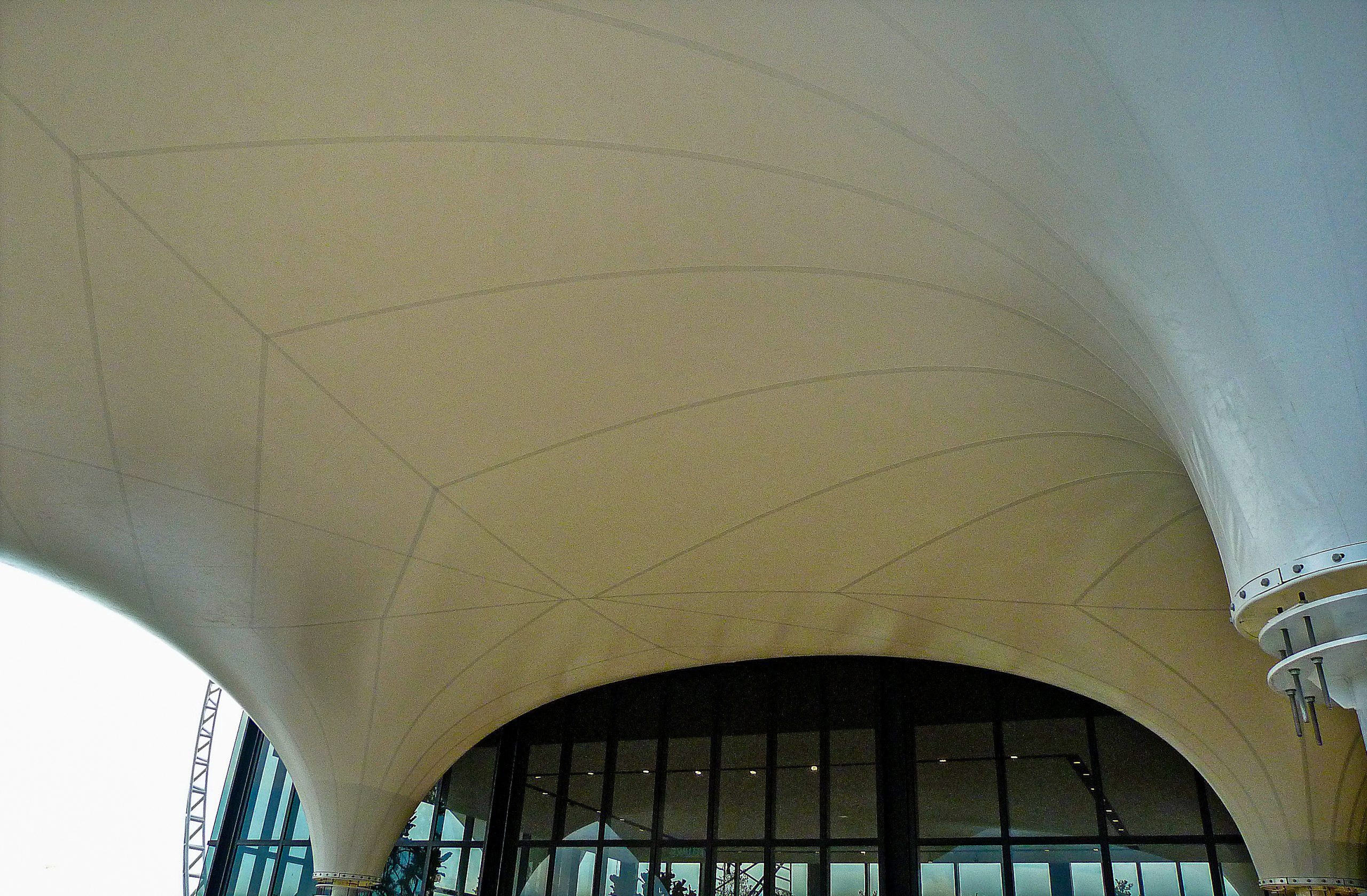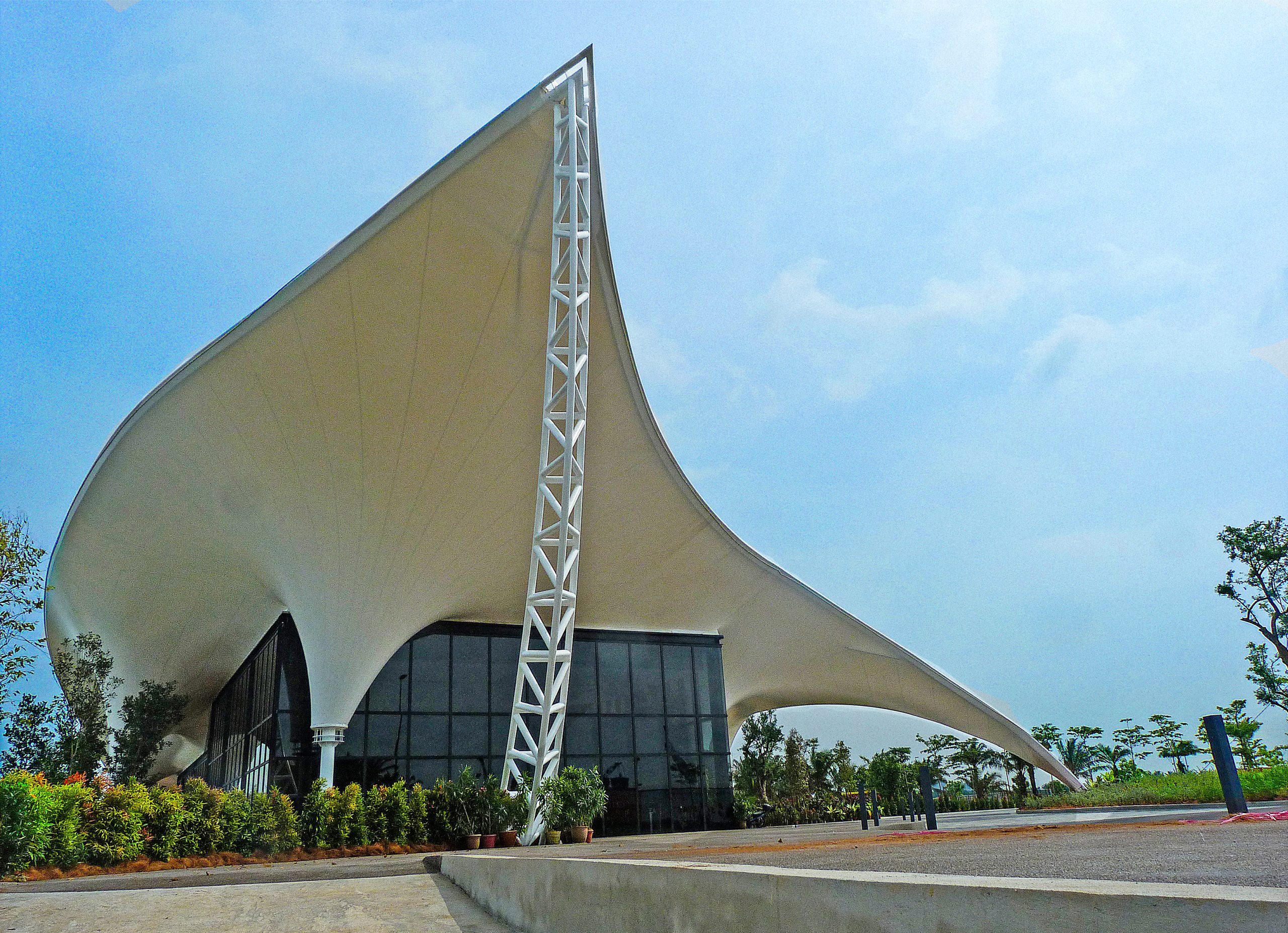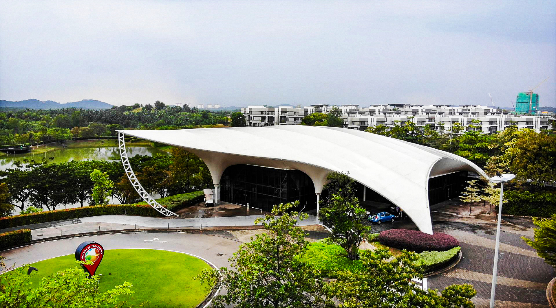The Sunway Iskandar Events Gallery sits on the banks of Emerald Lake, serving as a node within a network of eco parks, green pockets, water bodies, and green corridors. The distinct form of the roof canopy is envisioned as one elegant swoop, clad in TiO2-coated PVC fabric. The choice in material allows the building to emit a warm, soft glow in the evenings, and also reduces the need for heavy structural support, cleaning and maintenance. Sunway Iskandar Events Gallery Sunway Iskandar Events Gallery