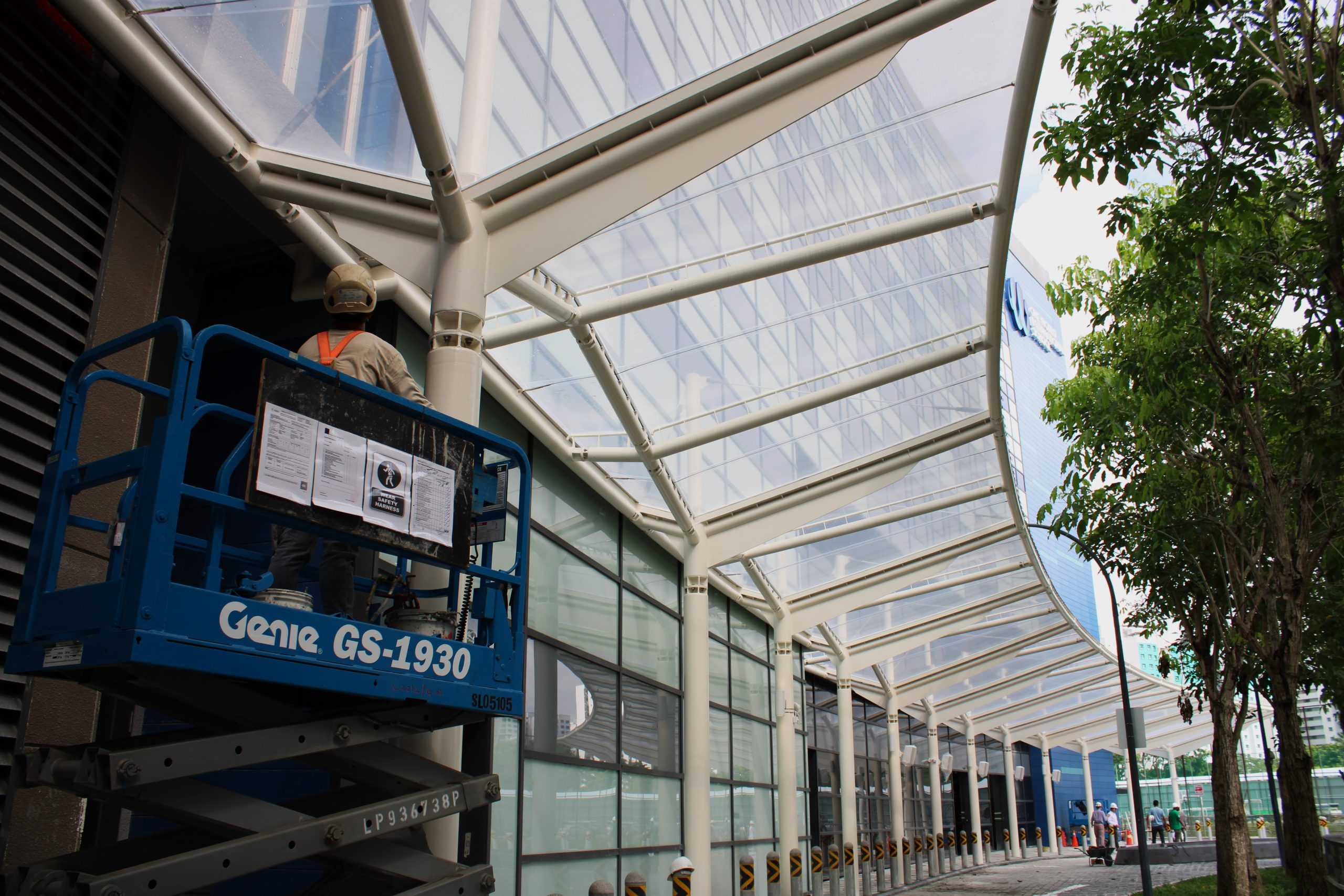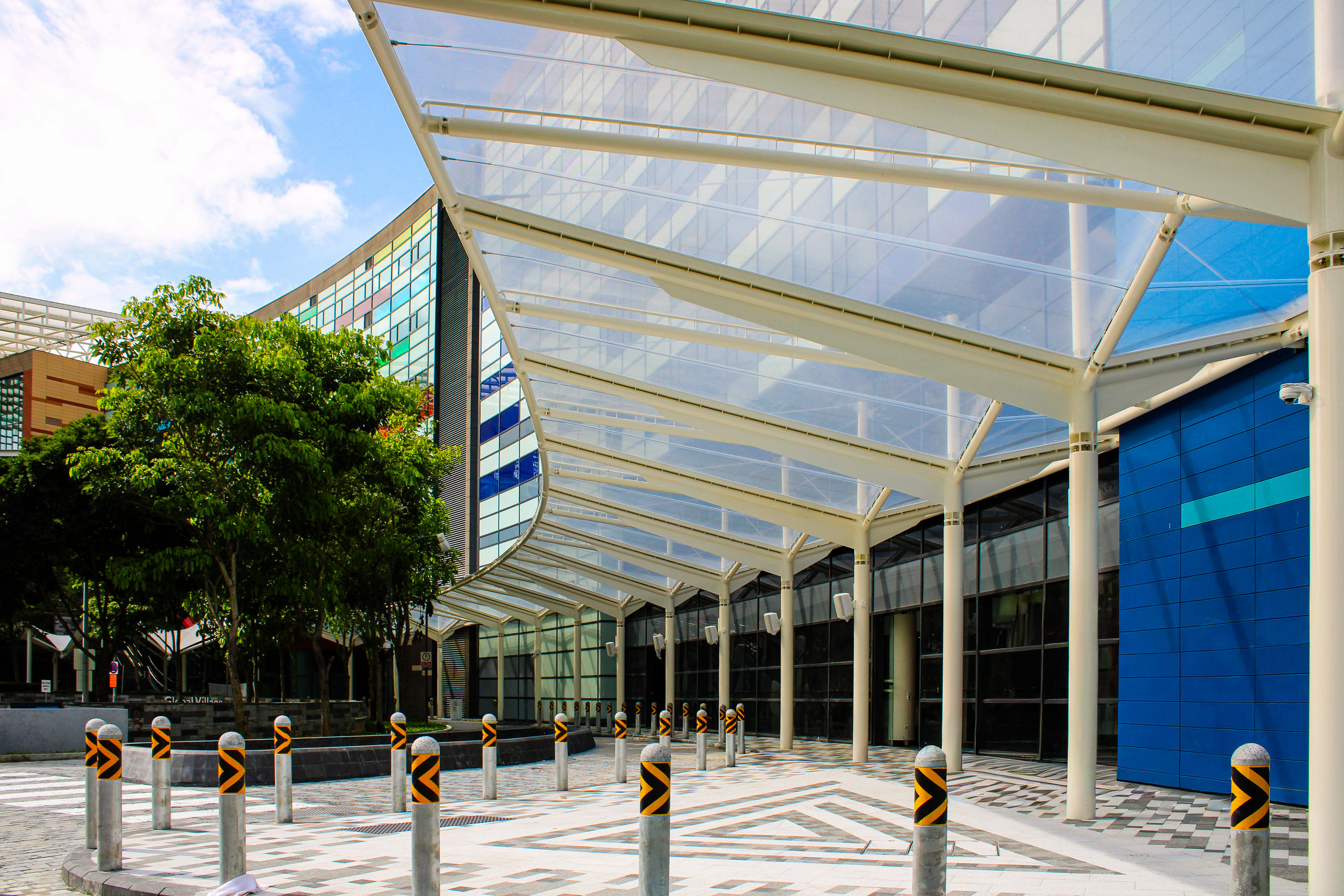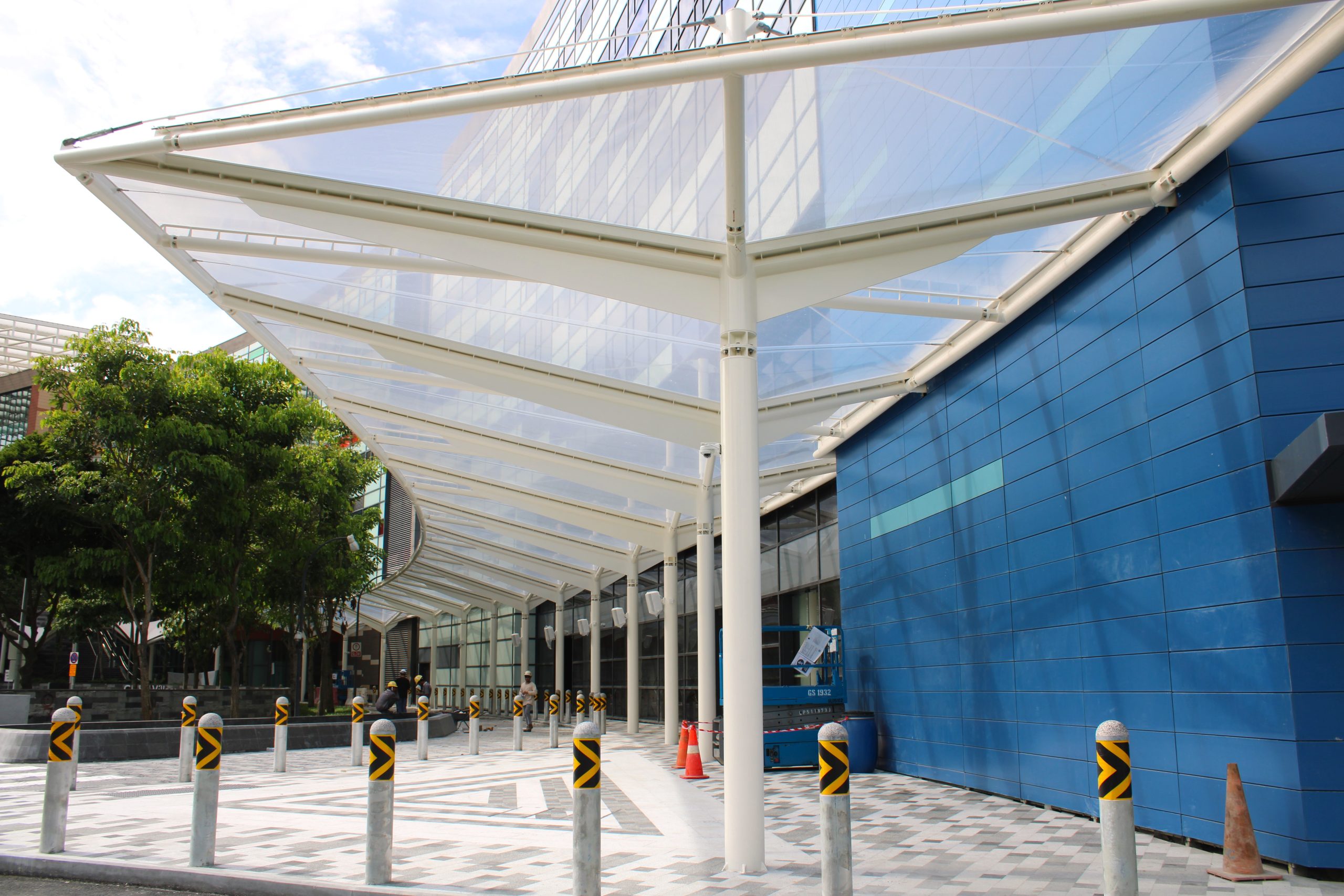 This drop-off canopy is a key addition to the new One World International School Digital Campus in Punggol. Designed as a unique curved structure, it shelters the area between the main entrance lobby, the exterior walkway, and the driveway. The ADAS® Single-Layer ETFE solution offers ample rain protection and sunshade along the driveway while maintaining high visibility. This innovative design enhances both functionality and aesthetic appeal, contributing to a welcoming entrance for the campus.