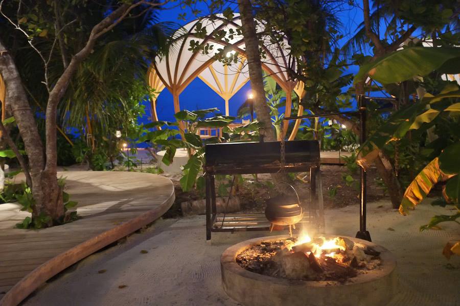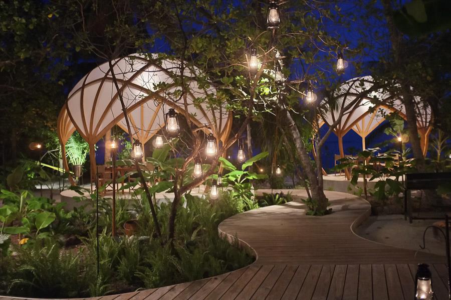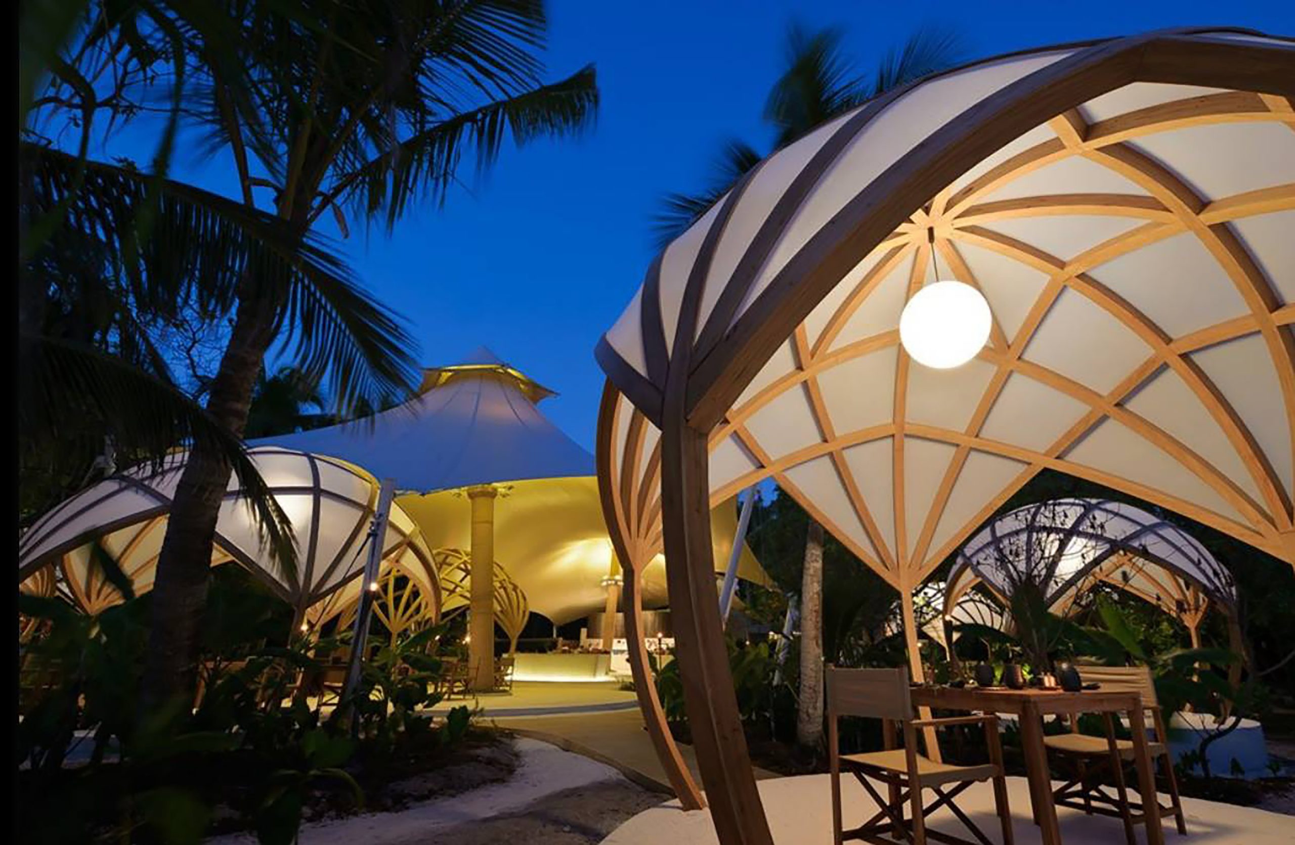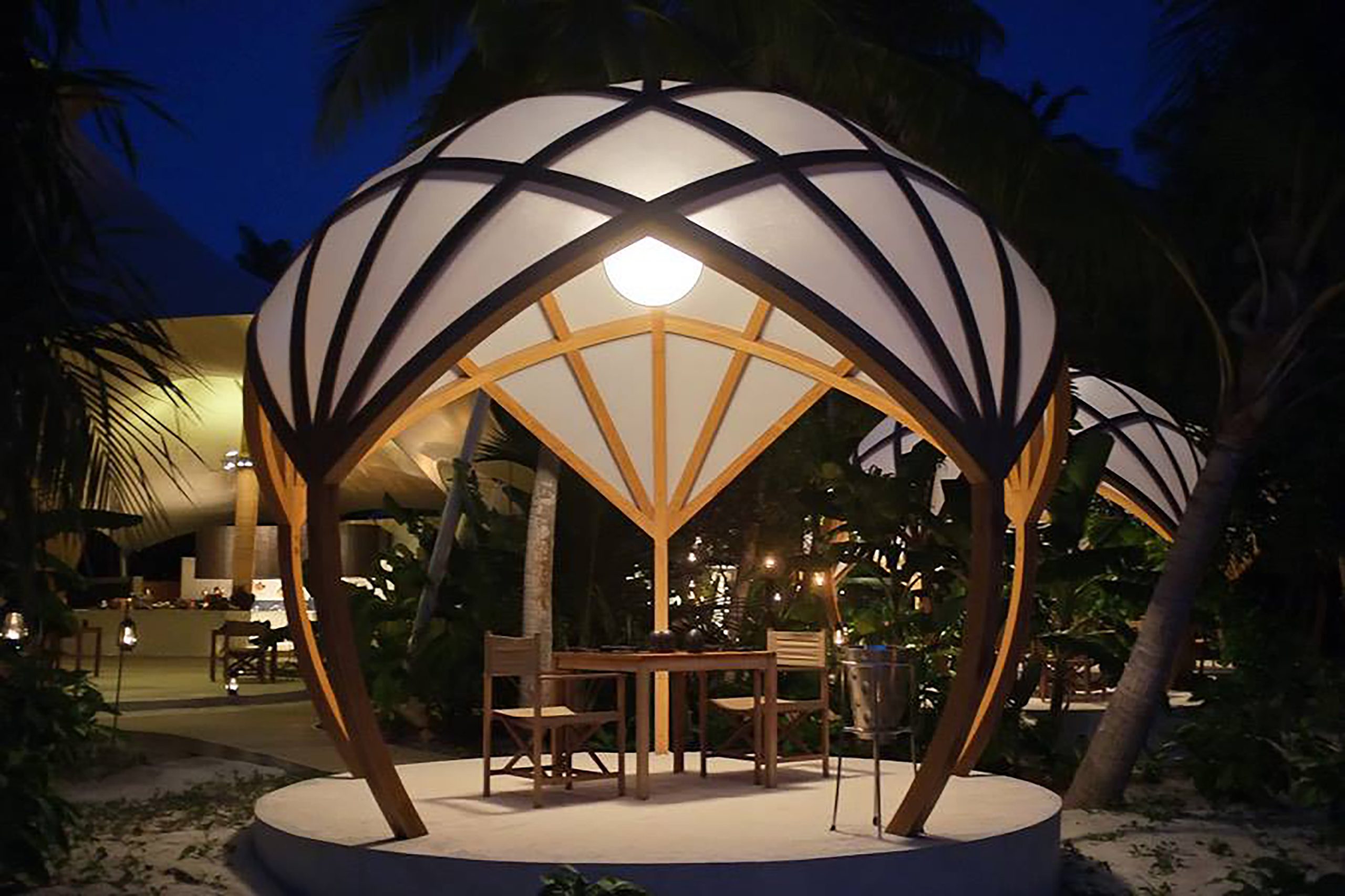 Designed and constructed particularly for the Tribal Restaurant at the Niyama Resort, Maldives, the dining pavilions consist of a larger tensile structure encompassing the main dining area, and several smaller, private dome structures. The dome structures appear at once both lightweight and intricate, with a minimal structure supporting the PVDF-coated PVC fabric. At night, the fabric materials reflect light and appear to glow, resulting in a unique and calming ambiance at the resort.